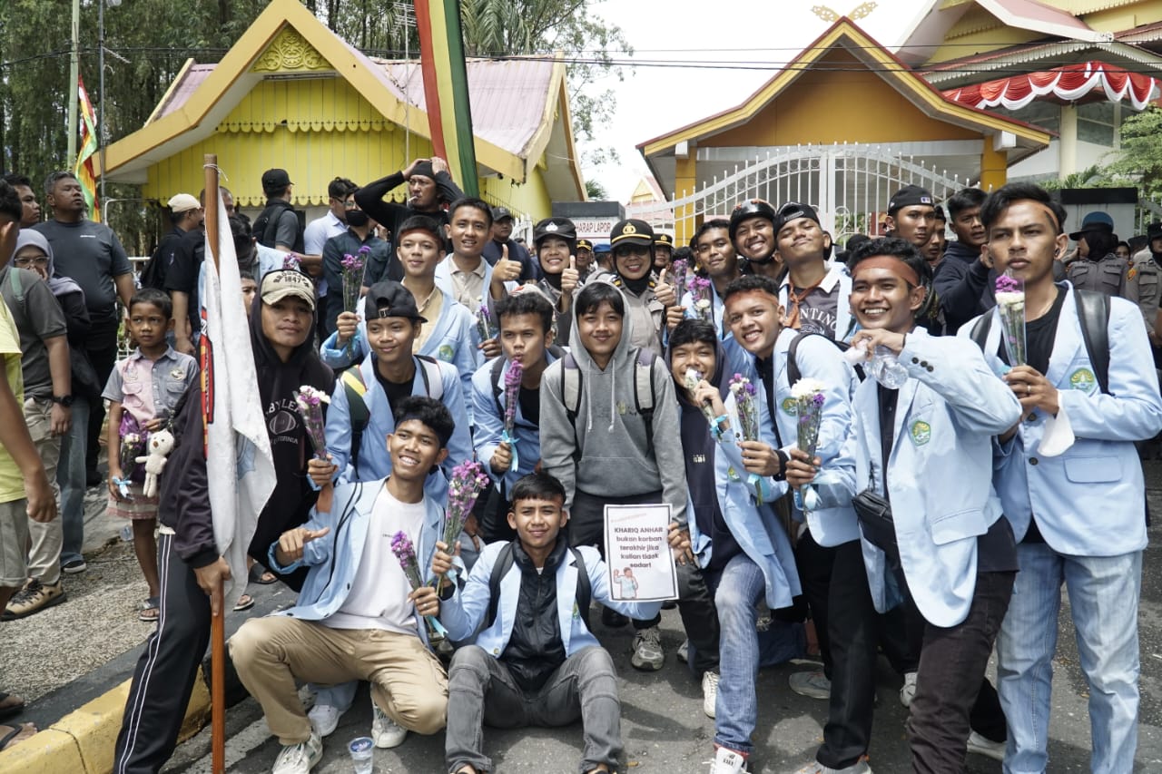 Polwan Polda Riau Bagikan Bunga ke Pendemo